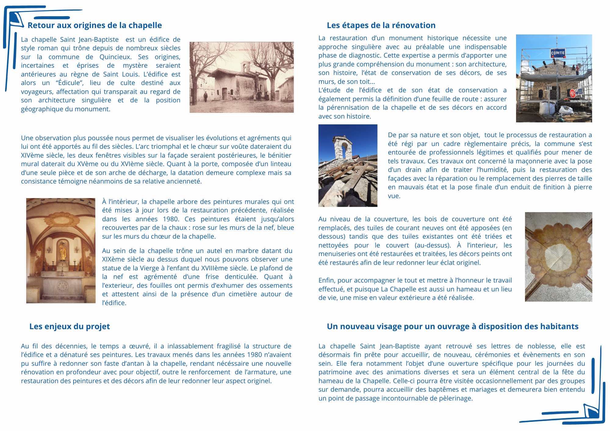 De par sa nature et son objet, toute la rénovation a été régie par un cadre règlementaire précis et la commune s'est entourée de professionels légitimes et qualifiés pour mener de tels travaux. Suite à cette rénovation, la chapelle Saint Jean-Baptiste est désormais fin prête pour accueillir, de nouveau, cérémonies et évènements en son sein.