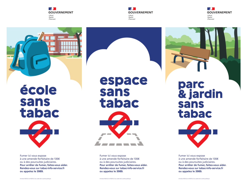 En France, depuis 1991, il est interdit de fumer dans les lieux à usage collectif (article L. 3512-7 du code de la santé publique). La règlementation prise en application de ce principe a progressivement défini les lieux ainsi protégés. Depuis 2006, il est interdit de fumer dans les lieux fermés et couverts accueillant du public ou constituant des lieux de travail, les moyens de transport collectif, ainsi que les espaces non couverts des écoles, collèges et lycées publics et privés, les établissements destinés à l’accueil, à la formation ou à l’hébergement des mineurs. En 2016, cette interdiction a été élargie aux aires de jeux pour enfants et à l’intérieur d’une voiture lorsqu’un mineur y est présent. La liste des environnements sans tabac est décrite à l’article R. 3512-2 du code de la santé publique, et c’est précisément cette disposition qui a été modifiée pour créer de nouveaux espaces sans tabac.