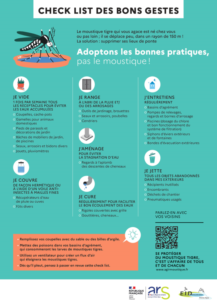 Le moustique tigre ne se déplace que dans un rayon de 25 à 50 mètres autour de son lieu de naissance. Celui qui vous pique est né chez vous ! Chacun se doit donc de prendre en charge autour de son domicile la destruction des "nids à moustiques" : jouets qui restent dans le jardin ou sur la terrasse, coupelles sous les pots de fleurs, vases, écoulements, gouttières, récupérateurs d’eau de pluie, mobiliers de jardin, piscines non entretenues, bâches...