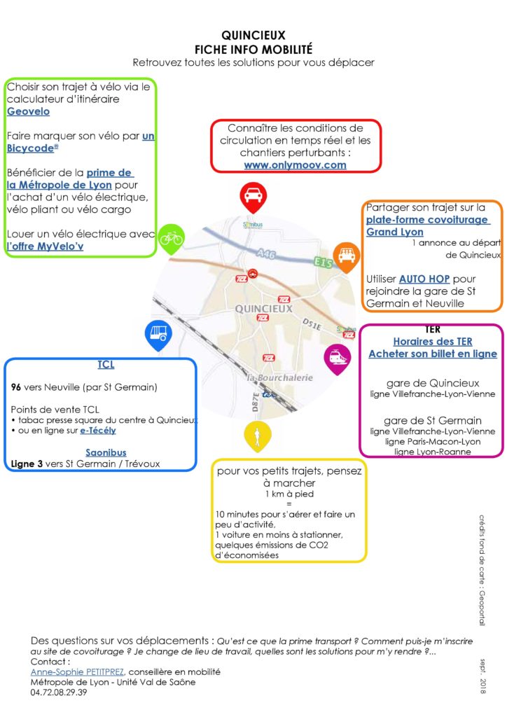 La gamme tarifaire T-Libr S (TER + TCL), permettant d'effectuer des déplacements à l'intérieur d'un PTU (libre circulation en TER et/ou réseau urbain à l'intérieur de ce PTU) prend en compte Quincieux sans modification de son tarif. Les habitants de Quincieux peuvent donc bénéficier de ce produit en remplacement d'un "Combiné TER + TCL" Quincieux - Lyon.